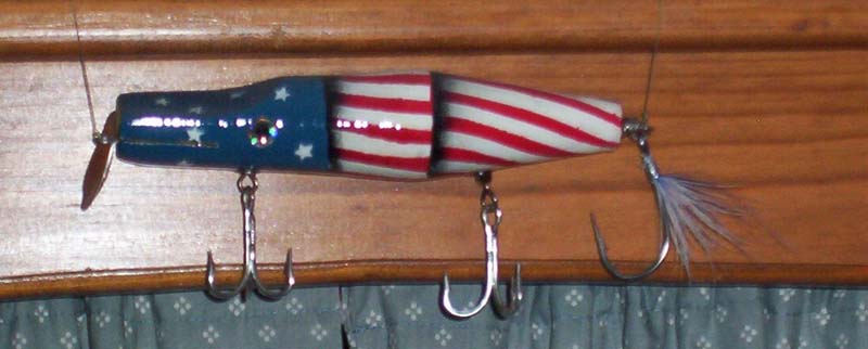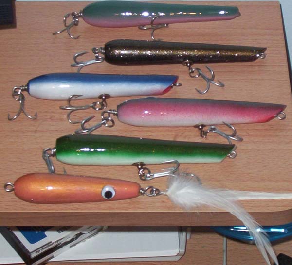 Here are some pictures of my first, every complete, to be fished pencil poppers along with a try at a squid and an attempt to copy the master painter Freak. Not to be the type of person who starts easy and works his way up I had to take a shot at copying one of Fishing Freaks Flags. I hope Freaks not to upset but I have a friend who's son is in IRAQ who likes to fish and I wanted to make something for him.