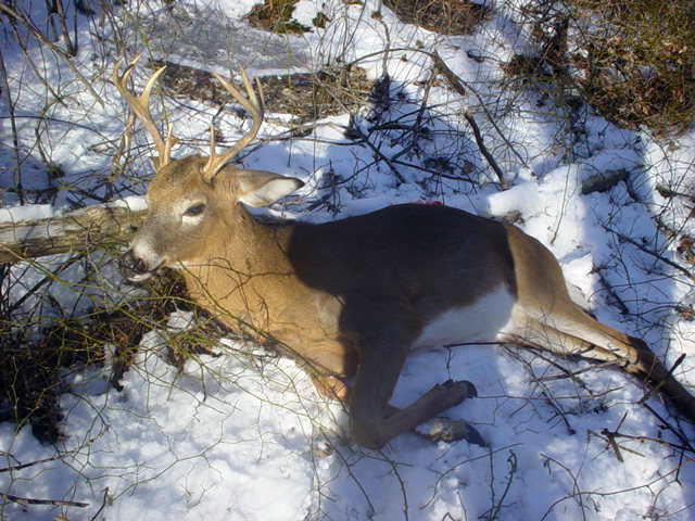 28 days after the rut, begins the post rut, which doesn’t last as long nor is as intense as the rut itself. On Monday when I seen this buck he was hot on a doe then on my walk back in the dark, twice I could smell strong tarsal. This is the time when doe’s that did not get bread during the rut now come into estruse, mother nature is perfect. This morning my brother and I followed the bucks tracks before I shot him and another indictation is that he is urinating on his tarsals as he walks, the only reason we know this is the evidence in the snow. The post rut actually started a few days before the full moon but I believe it is was more important that I was in an area that was thick which means no pressure. Bucks will not let their guard down especially during gun season.