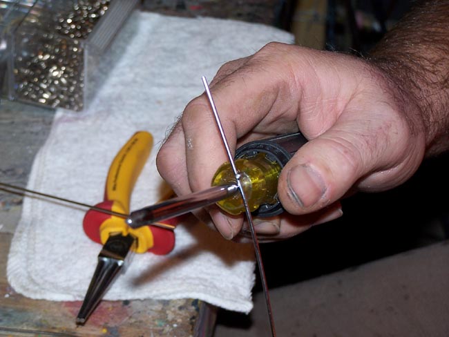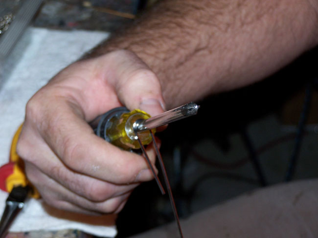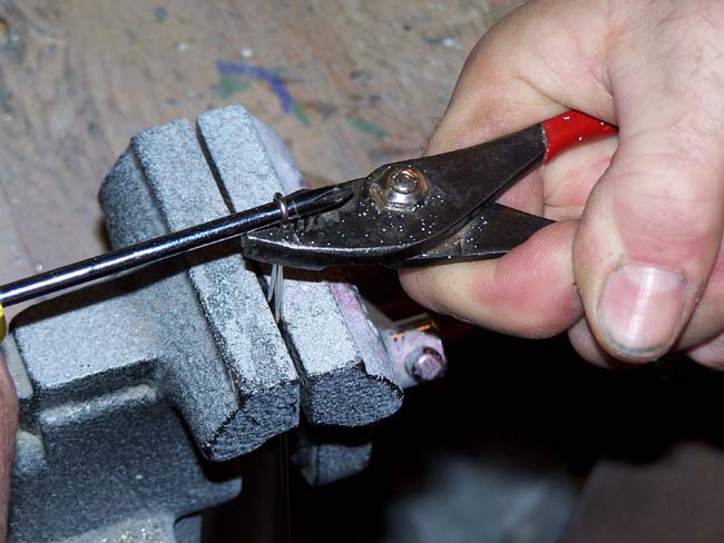 Here is how I do my front loop. fast and simple, takes less than a minute to do a wire. First I cut a tig rod in half and cur off the crimps from ends. Next I use an electricians phillips screwdriver with the stud on hamdle and place wire between screwdriver shaft and stud on handle.