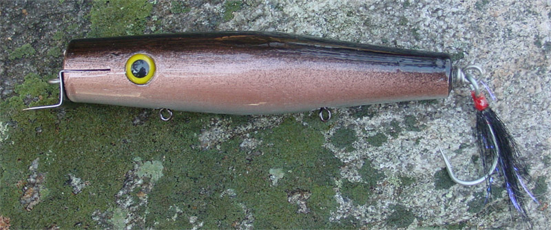western red cedar, sealed in Val oil, painted with rattle cans.. clearcoated with envirotex............ a true weapon of bass distruction