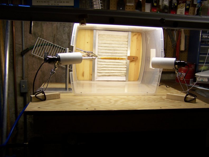 To hold the plugs I used a variation of the epoxy drying system I used in the garage. One side has a slow turning motor with a sewing machine foot pedal to move the plugs as needed