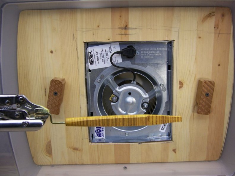 Screw the fan unit to the plywood and place a bead of caulk around the edge to seal.