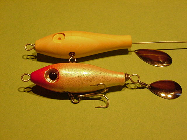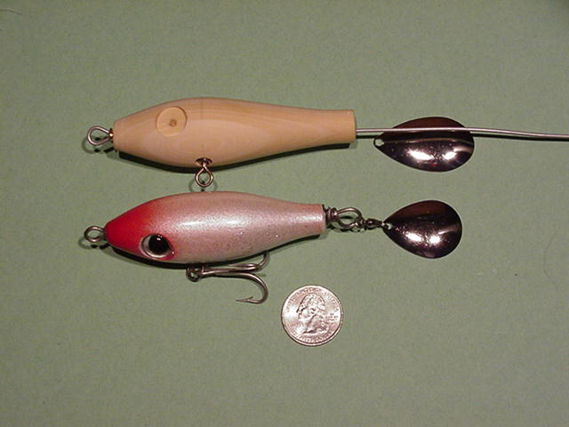 Yeah, a pencil weight cut to a 1/4 ounce and shoved up it's you know what to a spot 1/2 from the tail then a dowel is cut and drilled through for a rear end spacer to the rear grommet. It's just enough what with the tail drag from the blade and bb swivel.