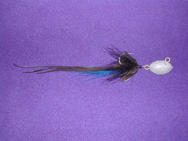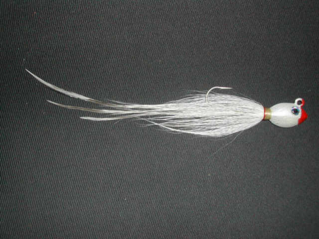 I know this is not wood but here is a jig I made a mold for at least 5 years ago. I poured a few and has sat down cellar since. I brought a few to last years plugfest and steelhead made a few tails for it. After the plugfest I modified it so the hair could be tied directly onto the jig itself and not have to be put onto the hook. It has a swing hook, 2.5 oz's. I am by no means a fly maker so you purest's will have to excuse the hack job but after dragging a few out to this years plugfest I was bored yesterday and thought I would try a few. I would think it would be good for fluke. Baby bunker? Any opinions?  P.