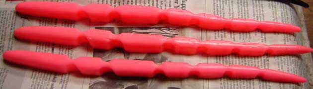Here is what we've been working on. A lot of you have seen these already. We pour them rigged and unrigged... I have no riggies left. They're 14" long and swim as though alive (we have a 10" in the works). Its been fun working with a new "medium" for a change.