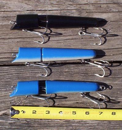 Jerry Sylvesters jointed plug,,,still messing with this .. First attempt was hard maple.. These are ayc and red cedar , Swim 1' - 4' down.. left one together to try as an eel plug..I threw 5/0 mustads on them would like to try a smaller diameter wire like orig. looking for 5/0 vmc ..