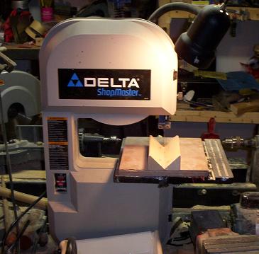 Bill,,,I ripped some pine 45 degrees on the table saw and glued and screwed it to the plywood..I clamp that in place on the bandsaw table centered on the blade... push whatever I want to split through.. falls off other side .. I also have an off center placement on this board I set up to do lips on round stock ..