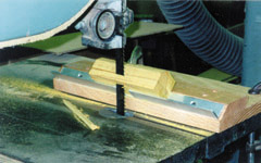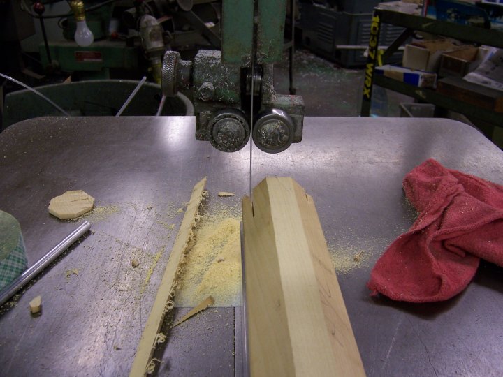 With several people using the home made type duplicator now I have a simple jig that will take the nerve wracking aspect out of the turning process which is turning square stock with a hand pressure tool. The edges. I know that it looks like a small amount of material being removed but it makes a big difference with this type of duplicator. It will save you time because you don't have to go so slow in the beginning to get the stock round. I do all my stock this way at once when I buy it. So when ever I need stock I just grab it and it is pretty much round already, octagon actually but much easier to use. 2 fast passes and I am round. No slow going to get to that stage. I do any length from 8' to small individual pieces. Now I know I am using an industrial grade band saw with a big table but you can bolt on a larger work surface easy enough. You might not have to. I made my jig out of aluminum but you can do the same with wood. Tilt a table saw at 45 and you have a V block. Make it long so the stock will be supported well. I have tried just using a table saw to cut off the edges of the stock. It will work but I found it to make a hell of a mess and dust bowl in my cellar not to mention kind of dangerous to the fingers.