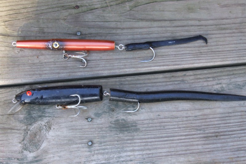 You might see some stuff like these on the market in the future. Easy to make if you don't turn wood, and they work very well. Top is 5" hab's with black 6" redgill. Bottom is 7" jointed bomber with back joint removed,5/0 siwash, and 6" ronz tail. Swims like the real thing.