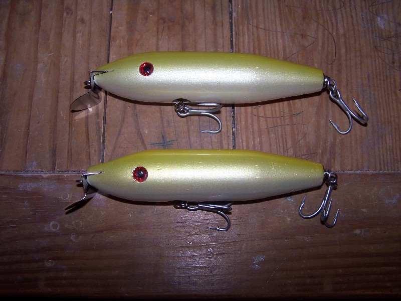 Just got back from taken 'em for a swim. Ended up switching out the 2/0 hooks for 3/0. Pull'em slow and they create a nice V-wake right on the surface. Pull'em harder and they dig down about 6-8 feet with a sweet side to side tail waggle.