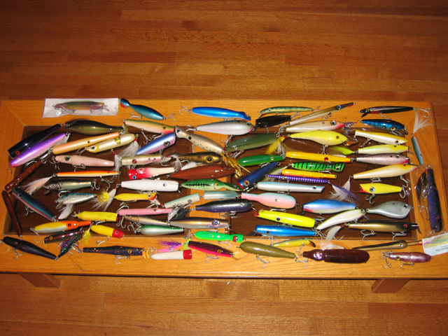 Obvious voids in the display I would like to fill include Manzi, Tagger, Slip, Flap, Numbskull, Eastendlou, Freak, and PNG (fricken' #^^^^& ho'd a beautiful Roman nike Chris gave me last MSBA show.... saw it and then had to watch him lose it...) I would say that a third have come via S-B fundraisers, a third bought, and the rest came through generousity of friends met though this site. Over three years, I have only finished maybe a dozen plugs, so haven't had the goods to swap with. They suck, so half have gone to locals who think their good.  The rest I just keep moving the weight around to see if they'll ever swim right.  Easier to try and ho...