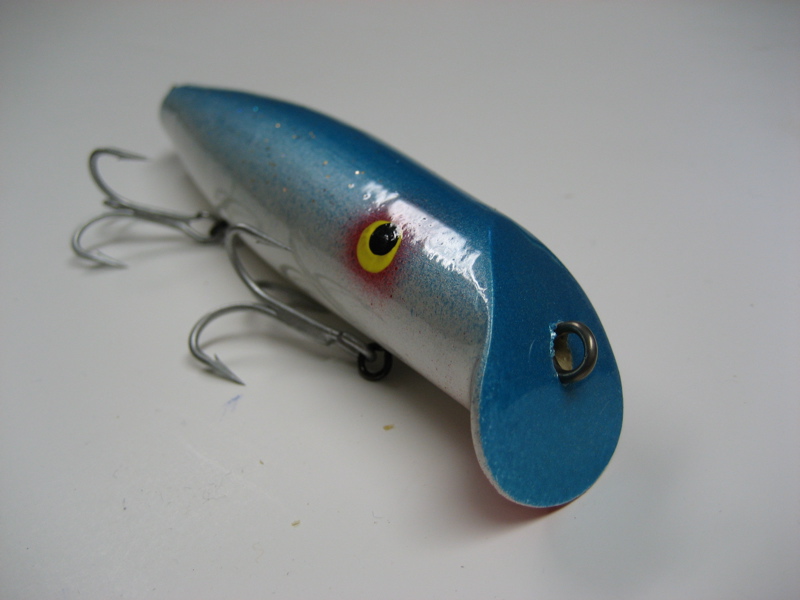 I think Paw Paw did, Eddy. It was one of the baits that got them going, I believe (but don't bank on it). Most of them had a deeply cupped face, almost popper style, but some were flat like mine. It swims pretty well............actually, too well........it has more action than I like in a swimmer. Tried to slow it with a heavy tail hook, but that brings the nose too high and it looses its bite. Maybe that's why they cupped the face. I'll probably upsize the belly trebles and put a tail on it (maybe with a little weight back there as well).