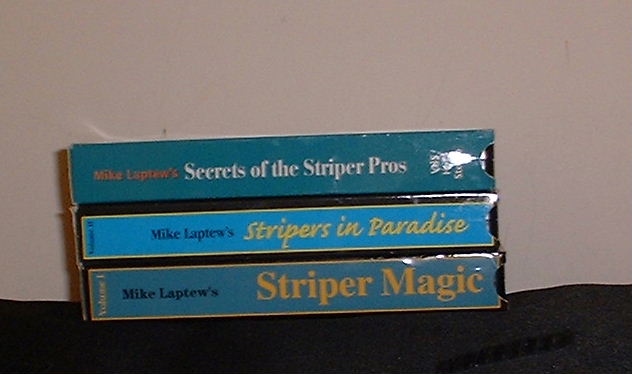 3 Mike Laptew Striped Bass VHS videos for sale. $30 for all 3. Guaranteed to work. Local pickup (NorthShore MA) or will ship USPS Priority with Delivery Confirmation for actual cost (approx $4.50 add'l).