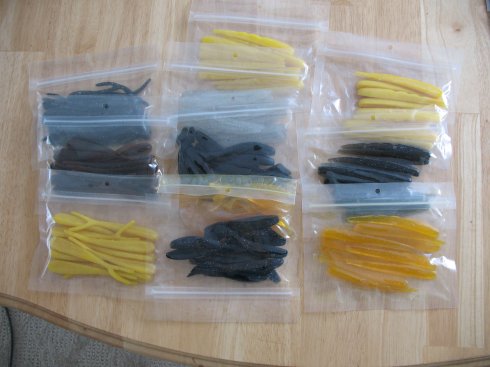 Small plastic sampler, all Ledgerunner Baits, 3 bags 4-1/2" split tails, 3 bags of 3-1/2" shads and 5 bags of 4" little jerks, in yellows, smoke, blacks and mix. Almost half price at $20 and you pay shipping.