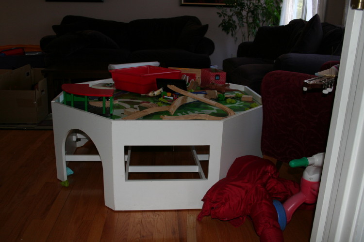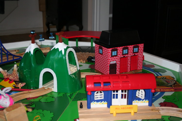 Got this 3 years ago, my kids never play with it and it becomes a junk pile. Its pretty big, takes up a lot of room. The tracks have been glued together a few times and a few of them are broken/cracked on the joints where they connect. Noting some wood glue wont fix. We have the instructions with the track configurations. Comes with a garage, bridge, mountain/tunnel. It has bins below it for toy storage. I believe its made by Battat. No trains included. It comes with a lot more tracks than in the picture.
