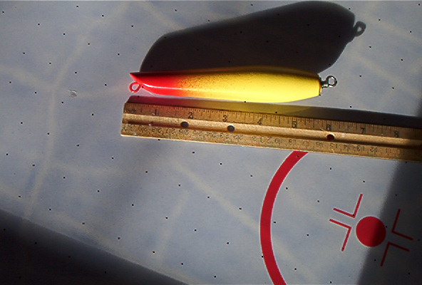 5 1/2 inches, and between 2 3/4 and 3 oz. I sealed em with the epoxy again. I want to see what bluefish can do to epoxy sealed hardwood. Ought to be a bit more of a challenge for them...