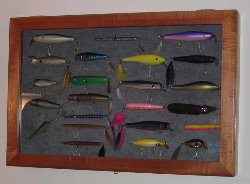 cases can be made to stand upright on a table ,,hinged together or leave as a single unit to hang///working from the face of the unit[if using glass] 5/8 to 3/4 for wood then glass 1/8" then about an inch of dead space to the face of your fatest plug..then for backing use 1/2" homosote overed in some cotton cloth which is all glued to the plywood backing behind that........use what they call T-pins..these can be found just about anywhere....they are a pin with a T on top instead of a button.....these's are then placed in the nose/tail loop as well as any belly swivel you see fit.and pushed into your backing....they'll hold any plug reguardless of it's size.