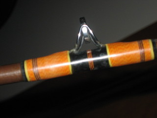 I bought this from a guy from Long Beach California. The length is 8'4" and it is one piece, no reel seat but I will include a Fuji plate seat. It is marked in handwritten script "Custom Built by Bob's Tackle" and "Browning Silaflex 12-25" I did find a tackle shop of that name in the Long Beach area listed on-line. It has 10 guides including the tip. Cork tape butt wrap. I'd guess it is from the 70s. The wraps are black under with orange and metallic red over... very well done. I showed this to Ron at Breachway B&T here in SoCo and he said back in the day using these guides on a blank with big backbone and a relatively soft tip was done for live bait and eels. Anyway... that's my story... nice vintage rod. Local pickup in RI. $115. http://www.striped-bass.com/Stripert...1&d=1161602338