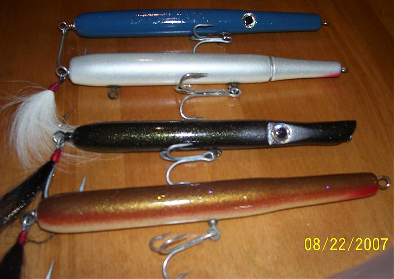 That looks like a nice lot. The l.i.fish.v.t on top is a fish catcher. Is that a MAC on the bottom? Looks like it minus the eyes. Cool eelskin needle too.
