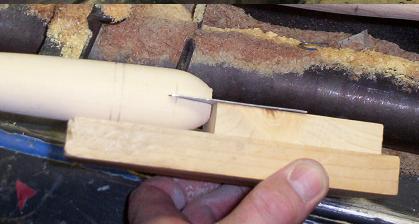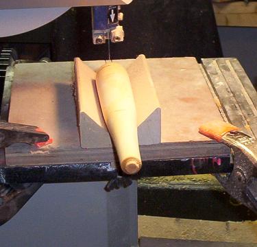 off to the band saw ... Made a V-block jig to cut yous guys plugs in half to see how you weight them ... comes in handy cutting lip slot too..Cut slot with top of plug you marked at 90 degrees .. I eye it ....