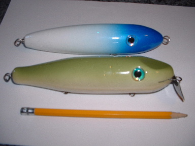 a couple large poppers for my conv out fit...red and white, I was trying to copy a gt bull, wasn't really happy with the copy but if I never seen a gt bull I probly be happy..the gt bull's arn't round they would have to be off center turned...maybe this winter...its ayc and weights 4.3/no hooks....blue and white ayc 3.4 /no hooks... and a pikie/surfster weighting 3.4/no hooks think its mahonagy(not the dence stuff,light) and a red ceder spook 2.4/no hooks...hope everyones out catching fish..I'm smashing down my porch its all rotted