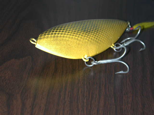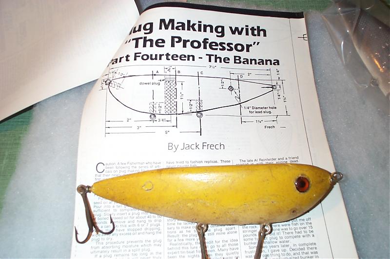 It is a "Frech Banana". Jack Frech published a series of plug building articles @1975 (reprinted @ 1989) in " The Fisherman" magazine. This a copy of his final plug. It is pine, 7 1/2" long, heavily loaded, and floats upright even with the surface, sort of a planer-style plug, not unlike the modern sluggo design. I have no idea how well it fishes, and his weighting instructions seemed too much, so I'm not even sure I've got it right. With a bandsaw, spokeshave, and rasp it is not too difficult to build, though some sort of carver's vise/jig is helpful. I think you could also do away with the hand tools and shape it after bandsawing with a rotary sander instead. If anyone has ever fished one of the originals (NIB maybe?), please pm me I'd appreciate any info that would help fine tune the weighting. Thanks.