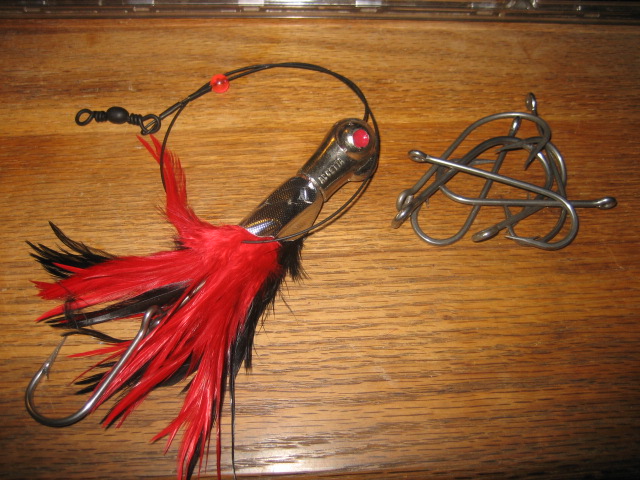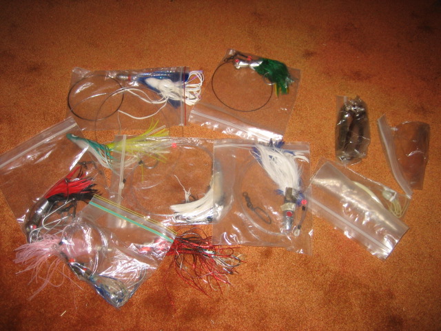 All either new or in very nice condition. Names... Accetta on two. No names on the others. Two are just the heads, no leaders. Eight appear to be complete rigs. Couple of plastic skirts. One diamond jig, guess around 6 oz. $55 shipped or pick-up SoCo, RI for $50. I have no idea what these are worth, so after a day or so, make an offer. I want them to be used.http://www.striped-bass.com/Stripert...1&d=1192552633