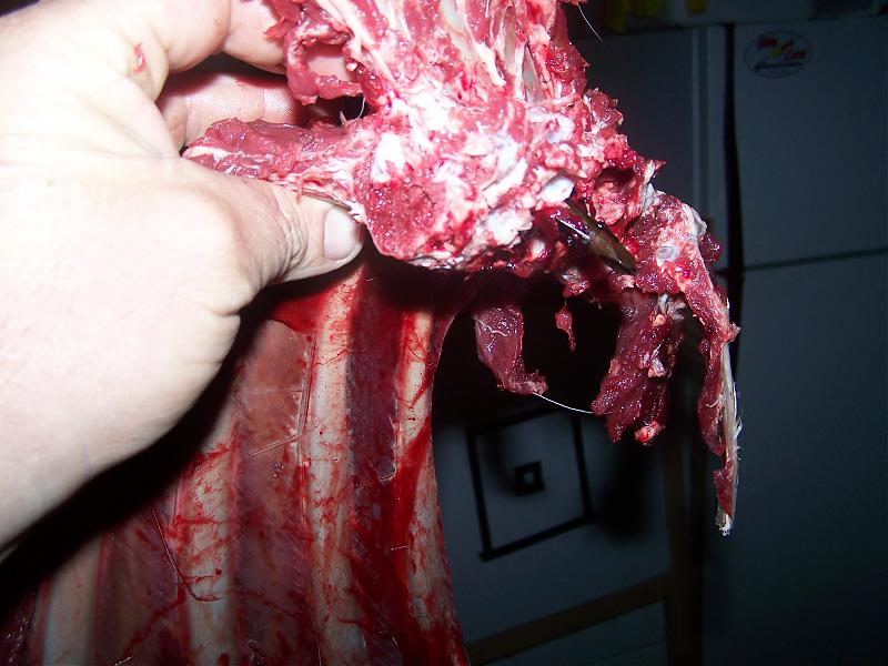 Fixed vs mechanicals... what a dilemma. I've never shot mechanicals but their are times I wish I had and I know a few guys that do shoot'um and wish they hadn't. This last deer is a good example of that. The arrow first went through the deers shoulder blade going through bone, not cartilage, then the broadhead disappeared into the spin. Even though I used caution I was surpirized when cleaning him that I felt the broadhead tip inside the rib cage. I shoot 3 blade muzzy 100 grain, they have always advertised to be "bad to the bone" and you can see why.