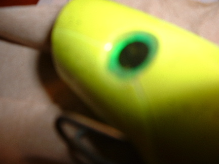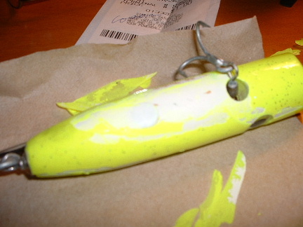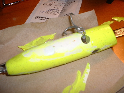 maple popper 2.7 oz...val oil/min st. mix....4-6hr soak...bins can primer....fl chartuse work type(safty)paint and devcon 2 30 min....epoxy split hard to photo but it split from the hook hole towards the back...also from the hook hole to the eye to the nose and a split from the tail along the top