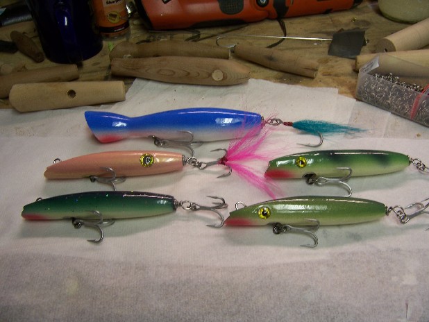 Thanks guys, I'm realy looking forward to plugfest, just the BSing alone would be great, but to see the awesome creations you guys make is the highlight of the winter. I tested all the above in the rapids under the mill st. bridge on the Ipswich river, seeing as that was the only water available, I had a devil of a time gettig them back over the rocks,just holding them in the current, the bottles were thumping the rod pretty good... at least the dannys were easy to get back, even in the screaming currant.. no roll out... I've got a bunch more assorted plugs primed, I just cant bring myself to paint them...I wont reveal those until the 'fest!