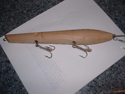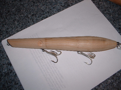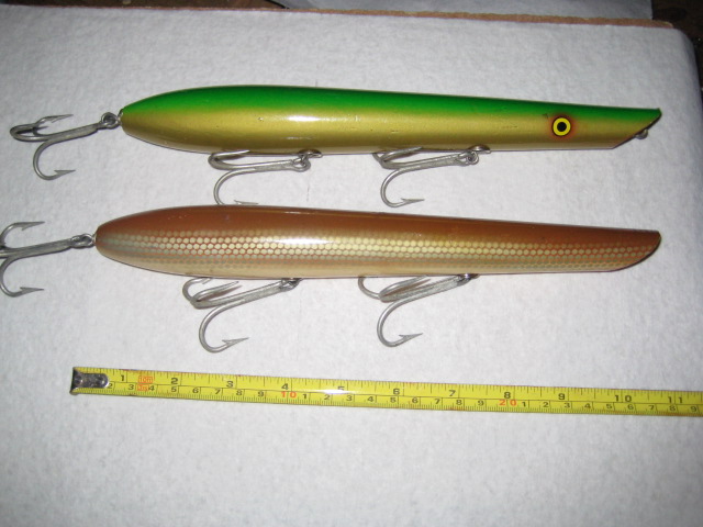 seen this and couldn't help it, had to try to build it...got the photo from e-bay and enlarged it and used a c-thru ruler to measure it off the box...lenght 10.5 inch.....the hip is at 7 7/8 inch and is 1 3/8 fat...nose is 3/4 and tail is 1/2 inch...first hook 3 1/4 and 2nd hook 6 3/4...I put a 1.1 oz 3/8 tail weight in it...1/2 inch eye useing the 1st hook line...its 4.1oz...does anyone have a real one, what does it weight? is it close  thanks ed