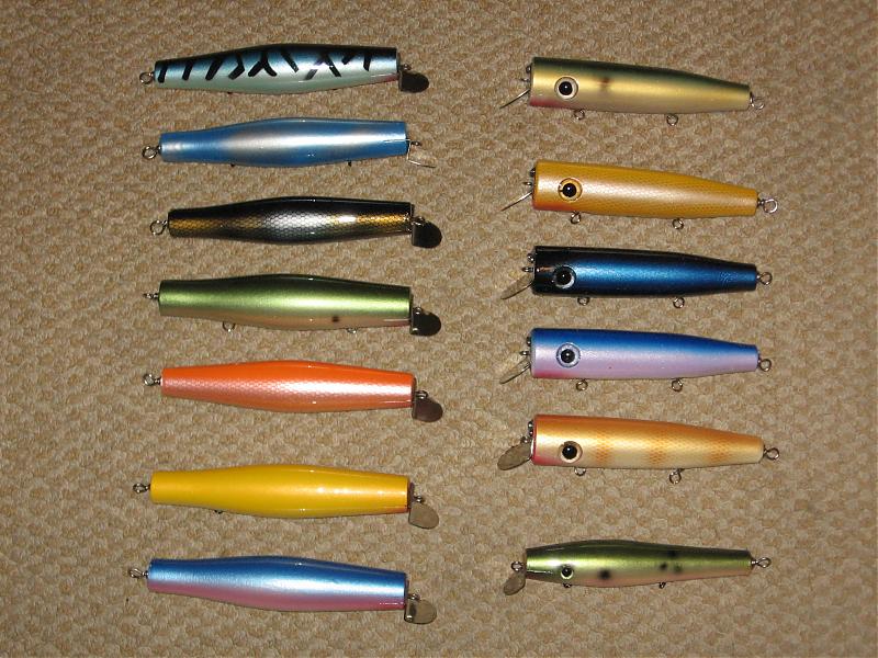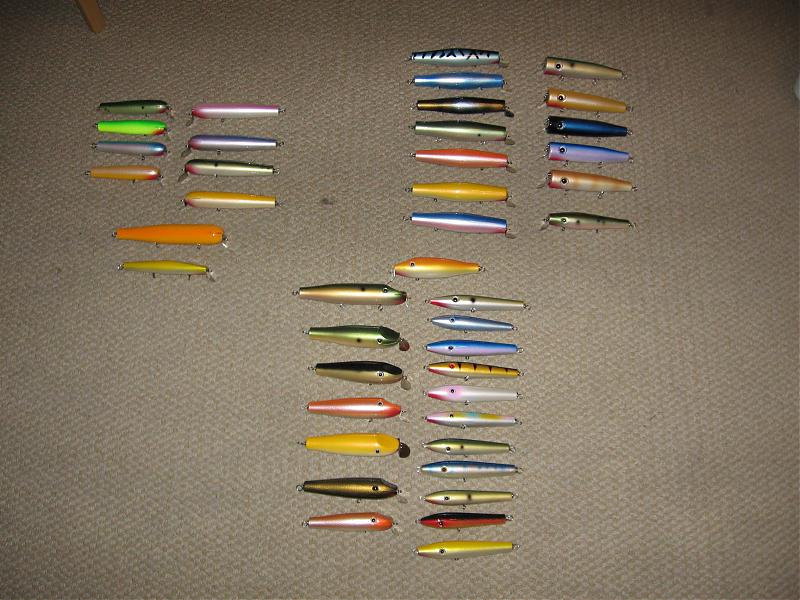 Well my usual assortment of stuff, Dannies, based on Mac's old dannies, Whats up and thanks Dave. Howdies, respect to the king of howdies, Bernzy. Where are you man? Pikies, Macs again. different sized atoms. And my new favorite Jake jrs. They swim on top like a pikie with quicker waggle.