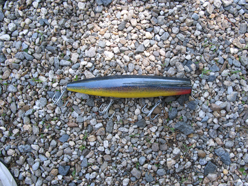 Cedar with a belly weight. Swims about 4 - 5 feet down. Sort of an eel color scheme.