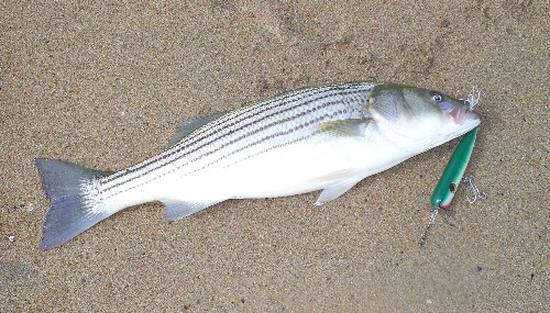 it all the way FLAT an it helped some. so I decide to keep him for bluefish bait.after a few casts into the surf, this is what happened. some fish wanted to eat the dam thing.must have thought it was wounded or nuts I guess. any ways I lost another 2 fish on that SICK plug, an learned a good lesson. when I started building 2 years ago I used EAGLE CLAW HOOKS cause it was CHEEP. but after checking the plug to see why I loosing hits it seems the hook was DULL. now it's VMC for me.that GREEN plug he is now retired, just hanging around.