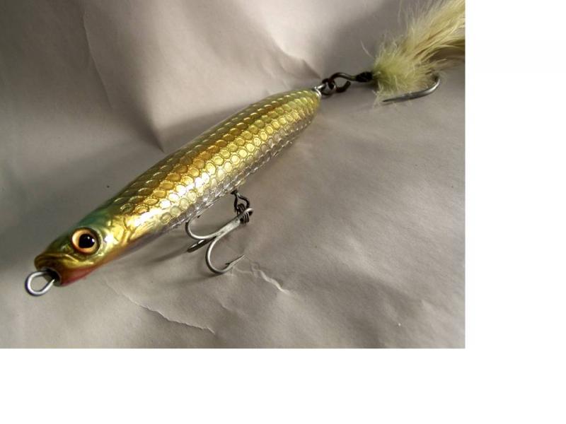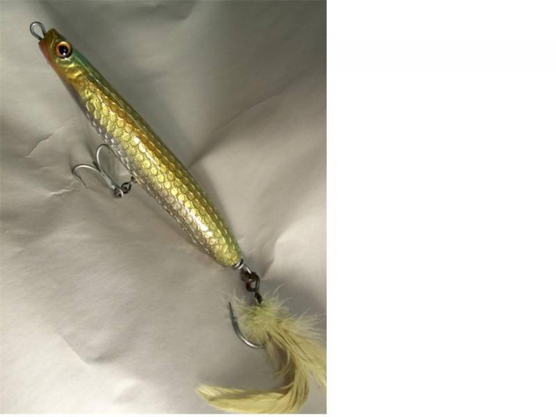 the original is a wood body, carved head with scales made from some netting that I found on some infant equipment around the house, I stretched it over the plug body and sprayed polyurethane on it to secure it, then I reproduced it by molding the original and ran plastic tubing through the mold, dusted it with metallic powder pigments and poured feather-lite plastic, the tube lets me through wire it and place tail weight(s) wherever I need to...the netting creates the effect of little mirrors all over the body, finished it with system3....I like carving more than turning and now I can reproduce them...I located a pottery supply website that sells mats in various scale pattern sizes so I'm going to try actual scale patterns on the next body...