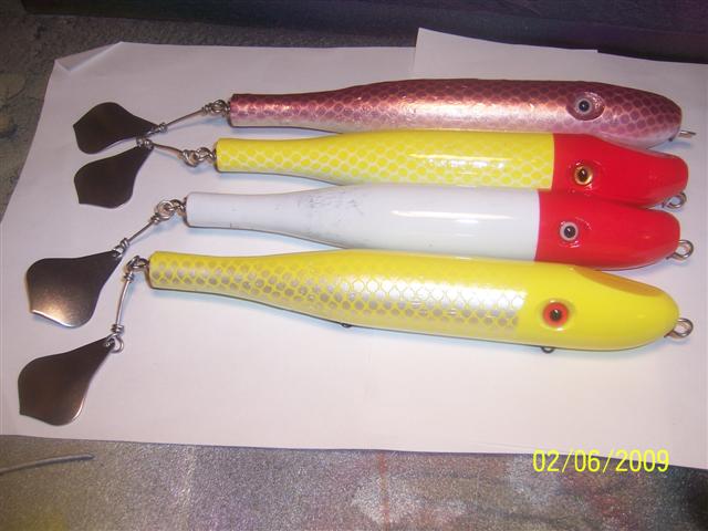 Awesome plugs .. Bubba .,, you have to get some good ball bearing barrel swivels .. I think Spro sells them . You can get them with a snap on the end to recieve your blade .. That and a small split ring to attach to the plug .. That blade will spin like like a motor boat .