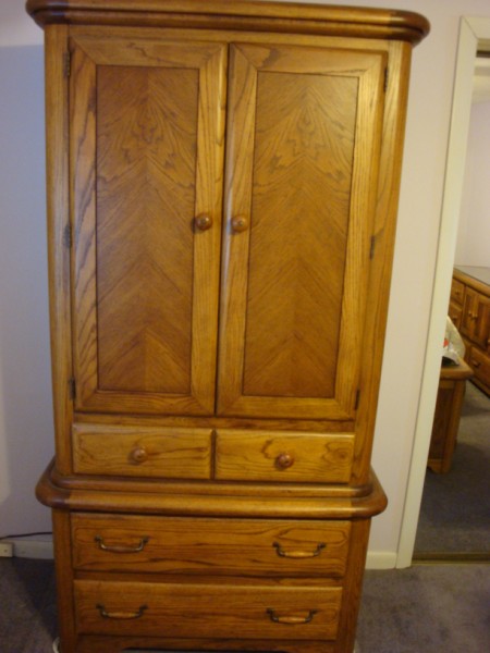 Mission Oak Armoir 76" High x 40" Wide x 19" Deep with double doors and 2 shelf's(can fit a small TV) and a drawer inside and another 3 large drawers outside.