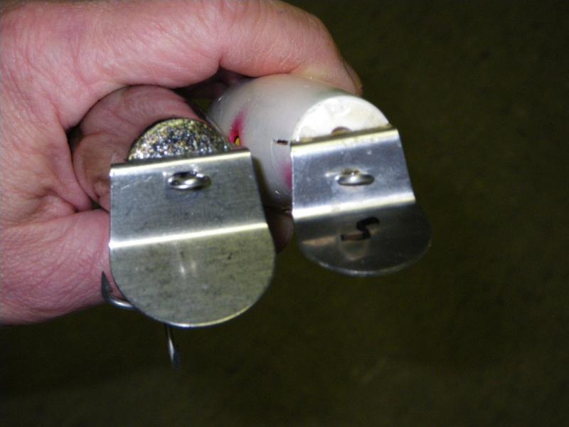 Turns out the weight in the surface swimmer is the same as in the Pine.........3/8 x a shade under 3/4....drilled through. The difference in weight of the unrigged plugs must just be variation in the density of the wood.