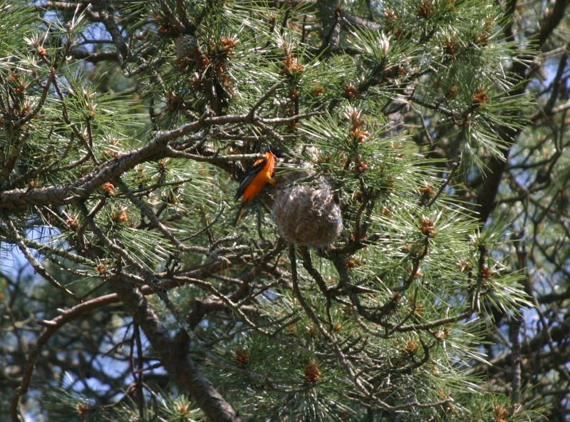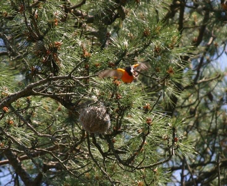 We had out first Oriole nest last year and are waiting patiently for the pair to return. The nest looks just like a sock. They had two babies last year and one was pushed to the ground below. I burried it. It was very underdeveloped.