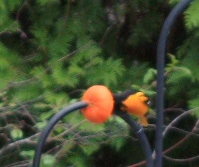 feeder outside the window (it is a very busy feeder) I looked up and ...Ohhh, its a Baltimore oriole. So I cut a couple of oranges and placed them on the old bird feeder hanger out back and he showed up in minutes. While waiting I saw 3 humming birds! i got this crude shot