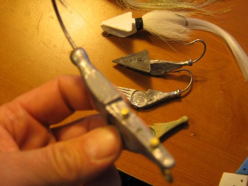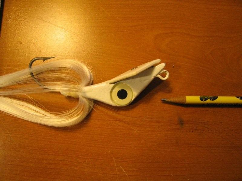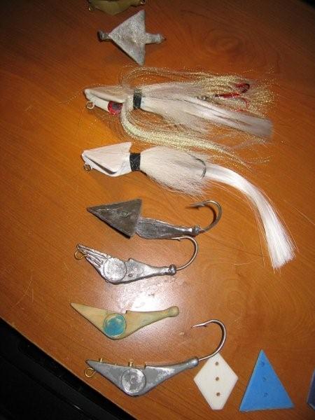 OK, my objective was a 3-4 oz bucktail that is designed to be cast from the beach and worked horizontally, not vertically...and has better depth control (and looks more like a squid). After 3 or 4 failures of stuff that didn't work exactly like I had hoped I am closer to a neat new design. I have caught a few fish with it early last season but I got so involved with plugs I had to put these down. I plan to fish them again this year and make some minor adjustments before finializing my mold.