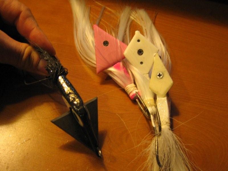 The bucktail is suppose to have a squid like look to it. The bulk of the weight is in the rear of this lure where it is thicker,(for casting distance). However this also creates a nose up (ass down) angle on retrieve. I was looking to generate this angle as well because I have a plastic "mantle" wing mounted on top of the bucktail that sees an angle of attack and creates lift. For now I make 3 different sized mantles, but use the smaller and middle size the most. What this does it allows the bucktail to cast well, sink fast and upon retrieve glide just off the bottom WITH A SLOW speed. They are very stable and all the weight hangs is carried by mantle. The large mantle allows a near surface retrieve with a slow speed. To be honest I only really need one wing, the small one is enough. The wing makes depth control much more sensitive to retrieve speed. The hook is a 9/0 stainless steel job that is embedded in the lead, the eye is a heavy ss loooooong eye that goes well into the body. I have not been able to rip either out, even in a vice. The nylon hair is reverse tied to allows for streamline casting and a big parachute presentation on retrieve. I have done several different materials, I like the nylon the best for this.