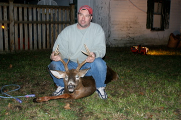 About 15 minutes later this guy walks out around 40 yards away, and stands behind a tree looking at me. a few minutes go by and he finally walks by broadside and I shoot him. There was no blood but lots of fur. Another guy comes down, and says the deer had been skirting between the two of us all morning. so anyway we tracked it for about 200 yards and then the tracks got all jumbled. We spread out 70 yards apart and walked till we found him. The drag out was about 700 yards.