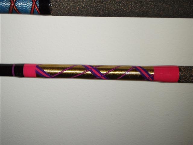 Walking the better half through her first custom rod this winter. Here is the butt wrap. Gold under with pink and purple free hand spirals, older XRA 1204 blank.