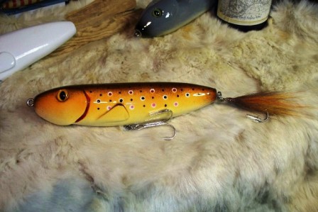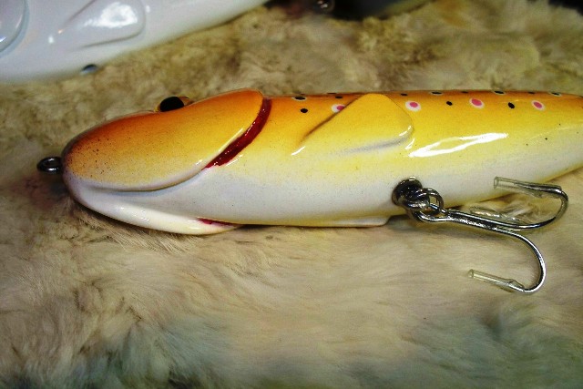 this one was done w/ carving tools what were given to me.Rattle can Painted, still need to get FISH HEAD looking like a fish head, an the eyes are in worng. MORE PRACTICE  Ill bring it to PLUG FEST if you would like to fondel it.