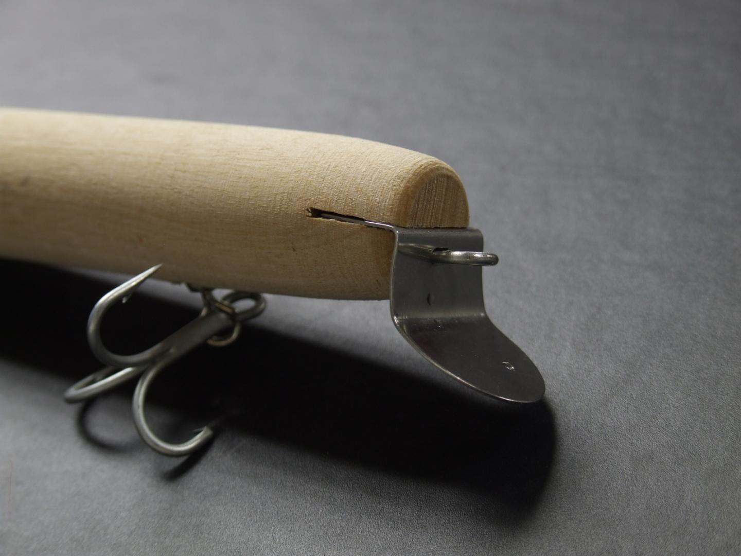 I tried for the inverted "V" on these plugs to facilitate a lot of action on a low speed retrieve. Guys who used to fish the back would tweak their giant pikies this way and would tell me to "Get the body joint out of the water and file the tail section down" so that's what I tried to do with these two prototypes.