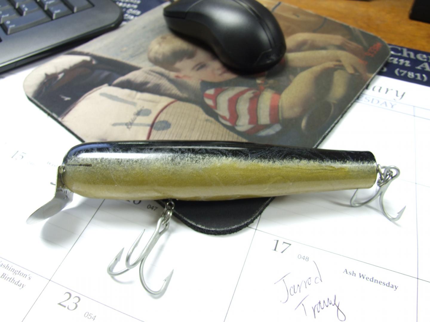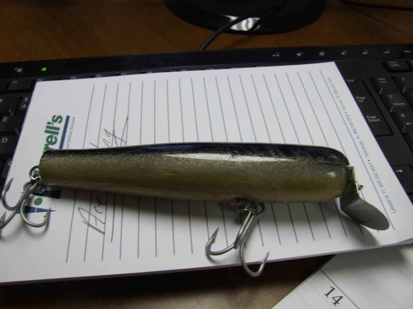 Anyways, I snagged it on the ice well out from shore and had to break the line, thus losing the plug. This afternoon I took my son, 100' of 1/4" yellow rope and a square shovel out to the crime scene and....I got the sucker back..  Anyways, I hope I'm not taking too long with this, but the plug was fully intact, no waterlogging or damage done after sitting in the water for 4 days. It does have a bit of a marble swirl going on the epoxy, but otherwise fine and didn't gain any weight. I'll have one on display at plugfest this weekend, although I won't be there personally.