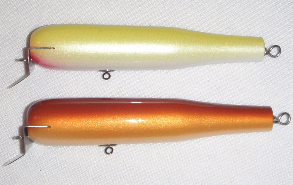 The first picture are modified cowboys. They are based on the old run of cowboys which in my opinion are a far superior plug than his more recent run. I trimmed some of the fat out of the back of the plug to reduce the rear buoyancy. This helps the plug get deep and swim much more level in the water particularly with a rear flag in place of a treble hook.