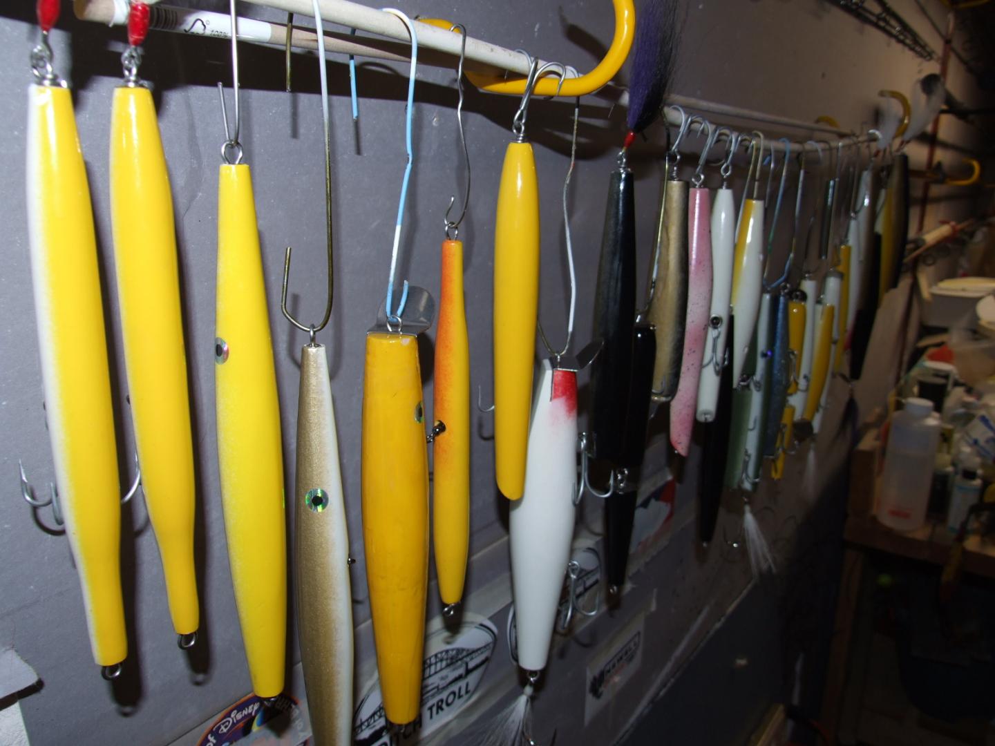 Here's the completed lineup, a nice pichney troller sr, and a good example of what happens when you get up at 4 am to do tail wraps and your pliers slip...no stitches as I didn't feel like driving 30 minutes....just splattered a little system 3 on the gash and it healed right over...