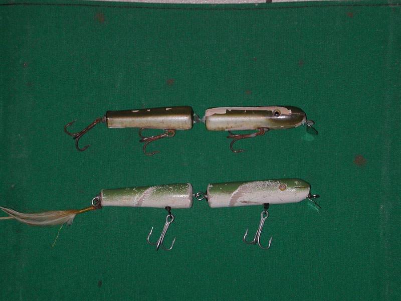 If you choose to make one I'd probably suggest birch instead of maple since you can always add a little weight (towards the back of the front section) or up your hook size to get it's bouyancy right. I've also read (in an old Frech article about the same plug) that you can make 'em out of pine, but I haven't tried it so far. They also made a bigger version, and I built one 12" out of maple which weighs a ton, looks promising, but is tiring to cast and I've yet to find something big enough to eat it. On the smaller maple ones, I've cut my own lips out of thinner than usual steel to keep the weight down. I think a small "lefty" style lip would work, however. I'd also suggest you forget the tail hook and use long saddle hackles under scant bucktail to give the plug a more sinuous action. This is an easy plug to make, a little trouble to tune, but get it right, retrieve with your rod tip high, and I think you'll like the result. Good luck.